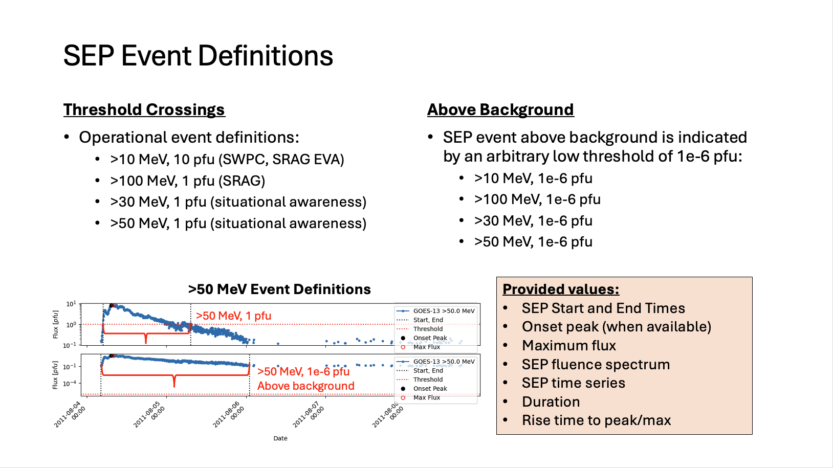 | Experiment | Flux Type | Background Subtraction | Time Period Start | Time Period End | >10.0 MeV 10.0 pfu SEP Start Time | >10.0 MeV 10.0 pfu SEP End Time | >10.0 MeV 10.0 pfu Max Flux (pfu) | >10.0 MeV 10.0 pfu Fluence (cm^-2) |